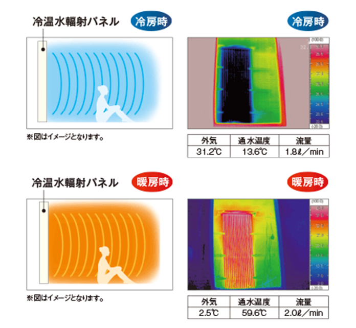 夏はパネルからの冷水による冷輻射で、冬は温水による遠赤外線輻射で自然の中にいるような心地よい空間に生まれ変わります。