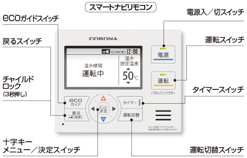 別売のメインリモコンを使えばタイマーや温度調節も簡単に操作できます。ecoガイドも搭載されているので、いつでも簡単にかしこく節約できます。